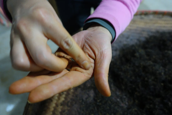 There will always be strings that are not fermented, which will affect the flavor of the final tea. While the tea is still wet and the discoloration is easier to see, a tedious step takes place where greener leaves are picked out.